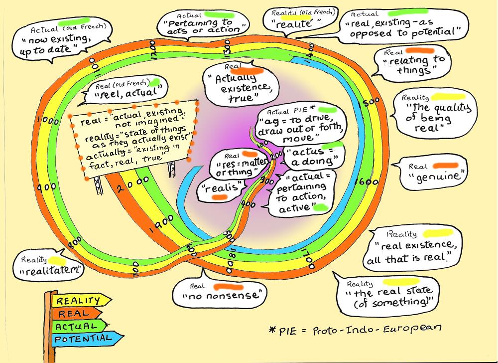 Its seems every English speaker has a different notion of what “reality”,“real”, and “actual” actually mean. So maybe it could be fun to go with https://www.etymonline.com/ and explore what these words have meant to people over the past two or three thousand years…