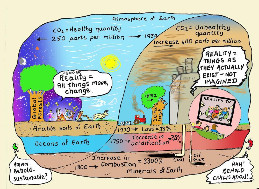 I was born into a world far, far richer in healthy forests, soils, oceans and valuable minerals than you were born into. As you can see in the above cartoon, our planet was a much more bounteous place in 1947. The evidence indicates that, in my lifetime, some people have actually destroyed the sustaining soils, minerals, oceans and atmospheric balances of Earth on a scale that has not occurred in 70,000 years, nor even in 7 million years and maybe not even in 70 million years.