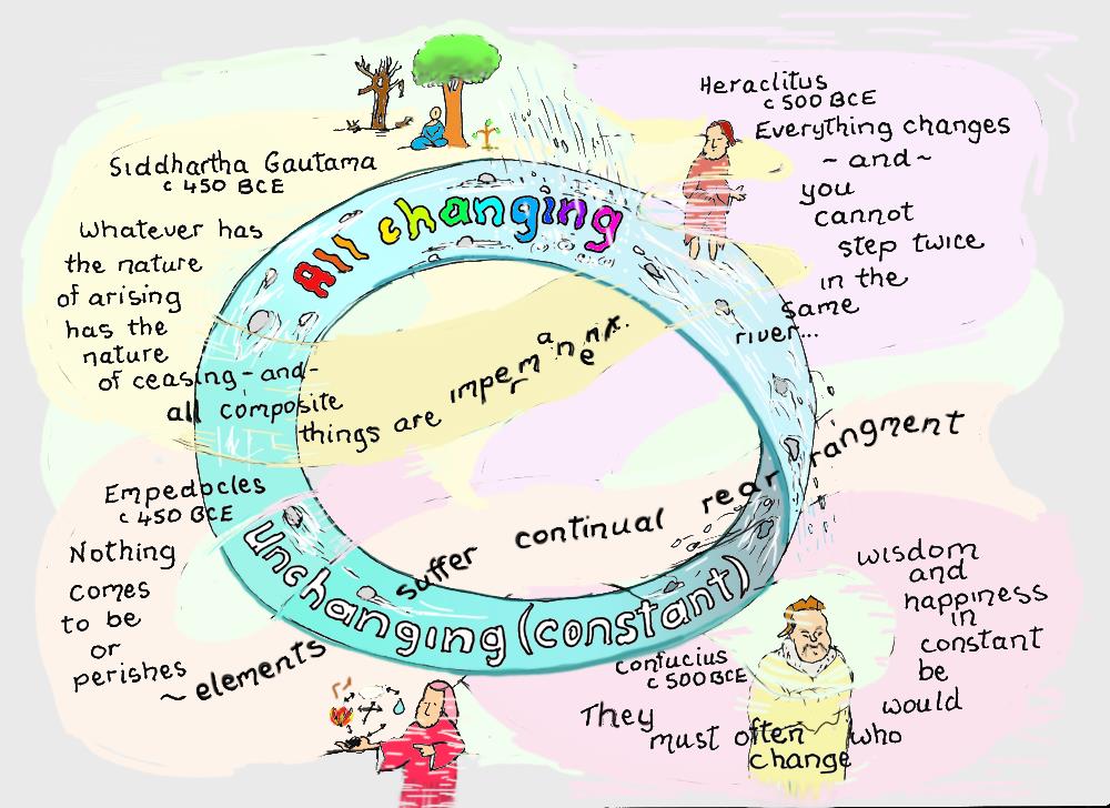Have you worked out the big idea the quotations have in common? Hint. Its about the universal reality and it involves paradox. Yes. It is the paradox of change: all the universe is continuously changing; change is constant. In other words, one unchanging aspect of reality is it never ceases changing.