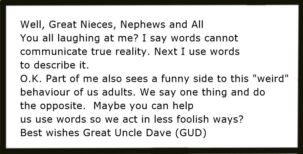The ego in us adults seems very hostile to any suggestion that there is a direct link or connection between what we say and what we do. Wonder why? Maybe, just maybe, a reason is that if we understand there is a essential connection between our words and actions, then the ego is less able to get up to its tricks and deceits. Have you noticed how we adults are very skilled at saying one thing and doing the very opposite?