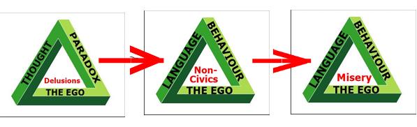 In brief, the ego only exists when our psyche is fragmented by self-awareness and thought. Born of division, it abhors all reminders of our mortal nature and thus strives to deny our fundamental interconnection with the continuous universal transformation. The ego’s potent, pivotal role in the information flows of our psyche means it can generate incredible self-deceits and ingenious rationales denying the principles of physics. The incapacity of the thought process to transcend paradox exacerbates the ego’s propensity to perpetuate unhelpful division. Hence the ego can thus easily generate delusions and have each of us be our own worst enemy.