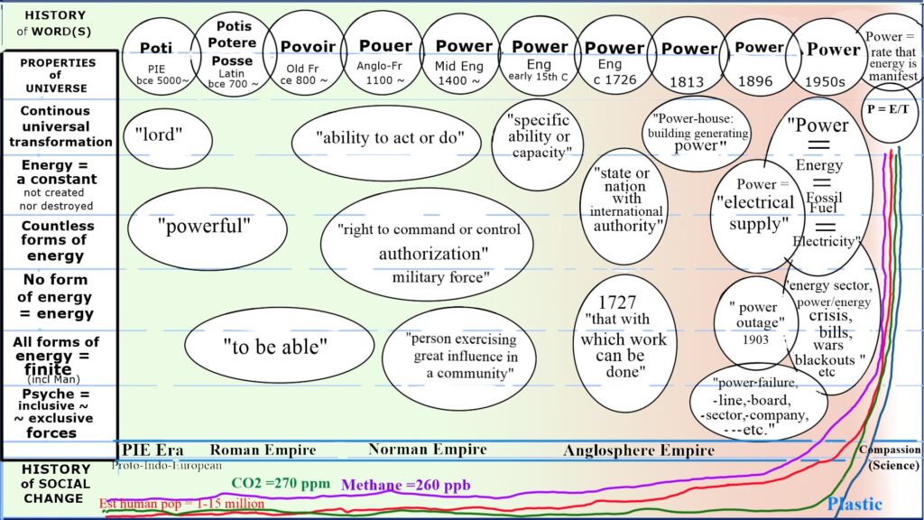 “Energy” here is defined as “a quantity that denotes the ability to do work”, an exclusive concept arising from English attempts to harness the power of steam engines in the 1800s. It is significant that “work” is defined as any activity that adds wealth to The Crown, an amoral notion that, in general, excludes the vital contributions of women, children and elderly people and that demeans both the majority of people on Earth and the planetary systems that sustain Mankind.