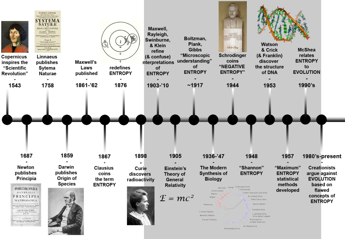 “Misinterpretations of entropy and conflation with additional misunderstandings of the second law of thermodynamics are ubiquitous among scientists and non-scientists alike and have been used by creationists as the basis of unfounded arguments against evolutionary theory. Entropy is not disorder or chaos or complexity or progress towards those states. Entropy is a metric, a measure of the number of different ways that a set of objects can be arranged. Herein, we review the history of the concept of entropy from its conception by Clausius in 1867 to its more recent application to macroevolutionary theory.”