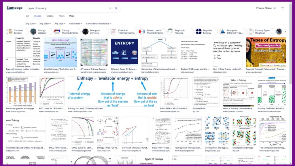 The above screenshot of the Internet search asking “types of entropy” also includes a reference to stuff called “enthalpy“, as in the equation: Enthalpy = “available” energy + entropy.